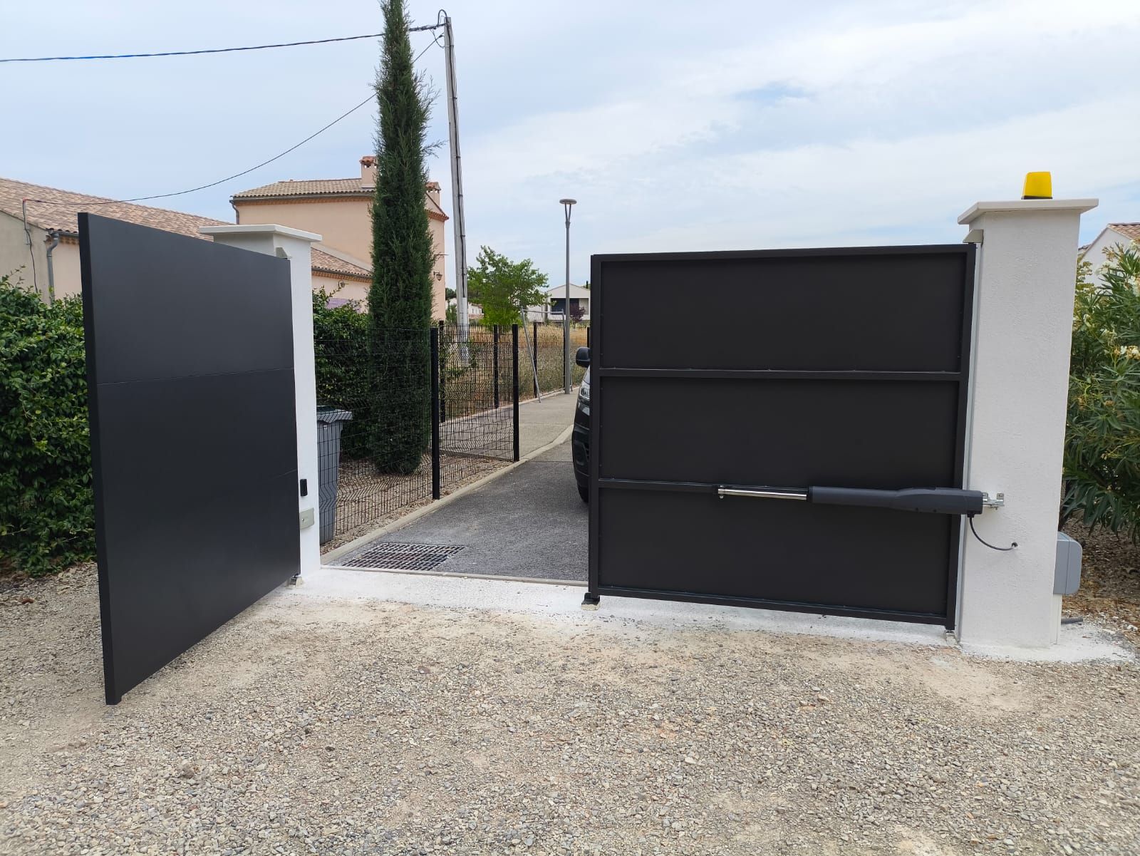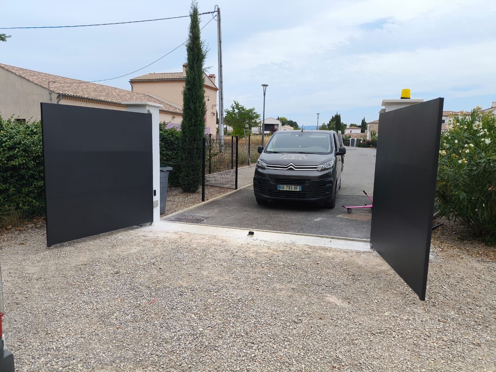Le portail installé est un modèle droit tôlé, offrant à la fois une ligne sobre et contemporaine, idéale pour s’intégrer harmonieusement dans un environnement résidentiel tout en garantissant une parfaite occultation. L’ensemble de la structure est conçu à partir d’une ossature en tube acier de section 40x40 mm, garantissant une grande solidité mécanique et une bonne tenue dans le temps.